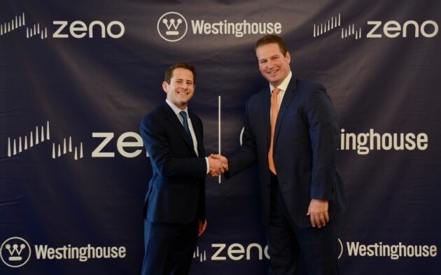 Zeno Power 首席執行官泰勒·伯恩斯坦 (Tyler Bernstein) 和西屋運營工廠服務公司總裁丹·薩姆納 (Dan Sumner) 在攝像機前握手。(芝諾·鮑爾照片)