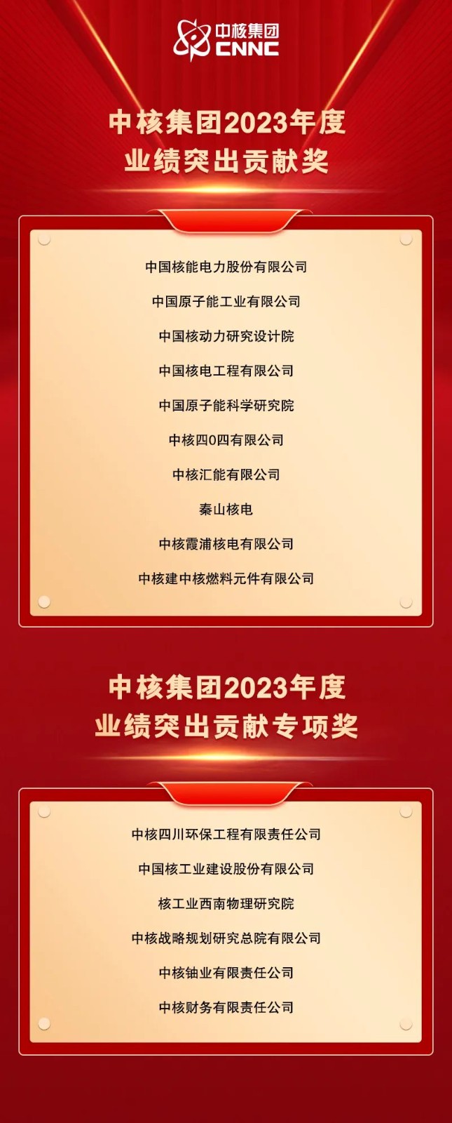 會議對獲得集團公司“2023年度業績突出貢獻獎”的10家單位及獲得“2023年度業績突出貢獻專項獎”的6家單位,奮進中核人、全國質量獎獲獎單位、國際標準牽頭編制單位、伯樂獎獲得者等進行了表彰。