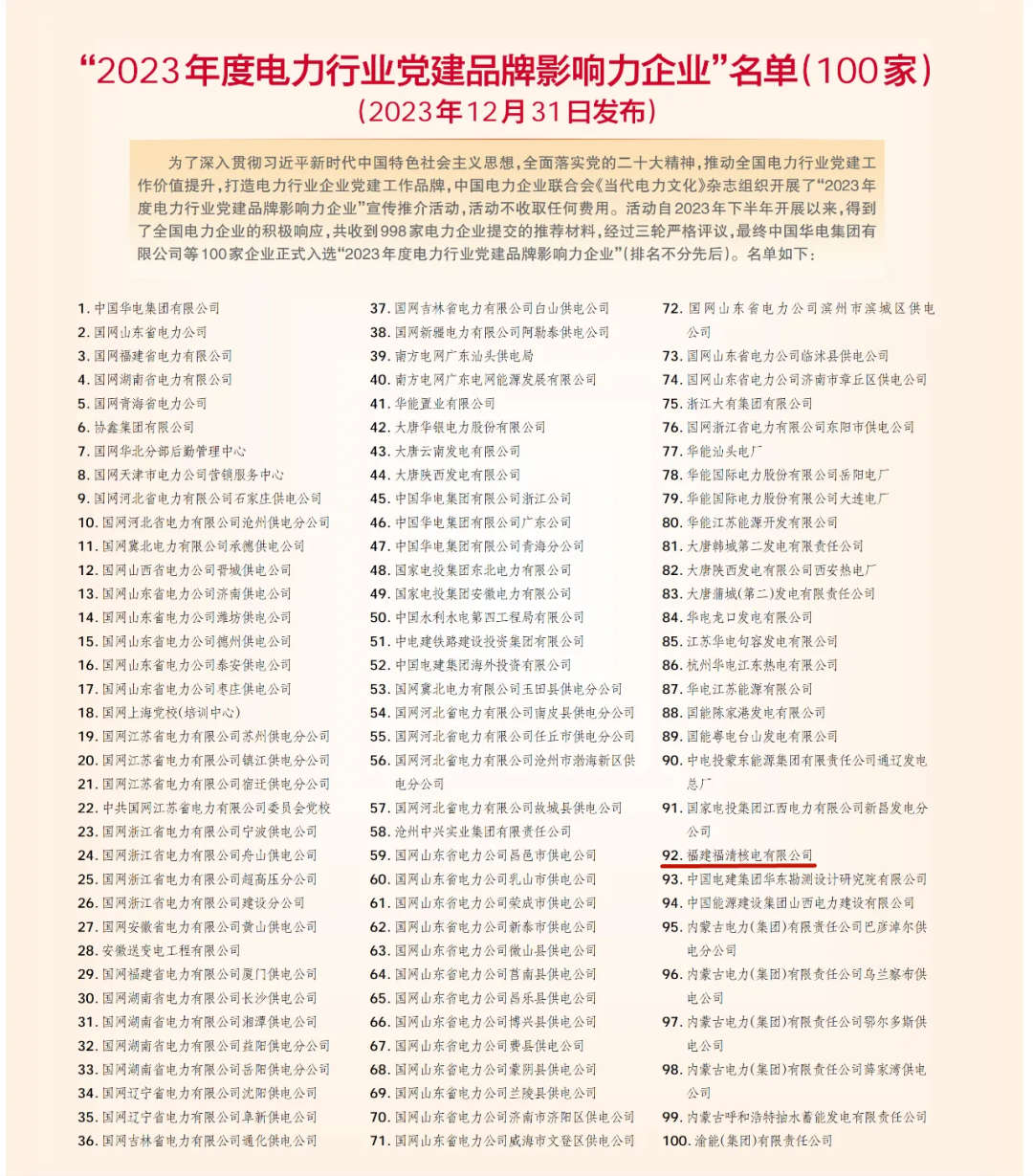 近日,中國電力企業(yè)聯(lián)合會《當(dāng)代電力文化》正式發(fā)布“2023年度電力行業(yè)黨建品牌影響力企業(yè)”名單,經(jīng)過三輪嚴(yán)格評議,福清核電從近千家電力企業(yè)中脫穎而出,成功獲評“2023年度電力行業(yè)黨建品牌影響力企業(yè)”。