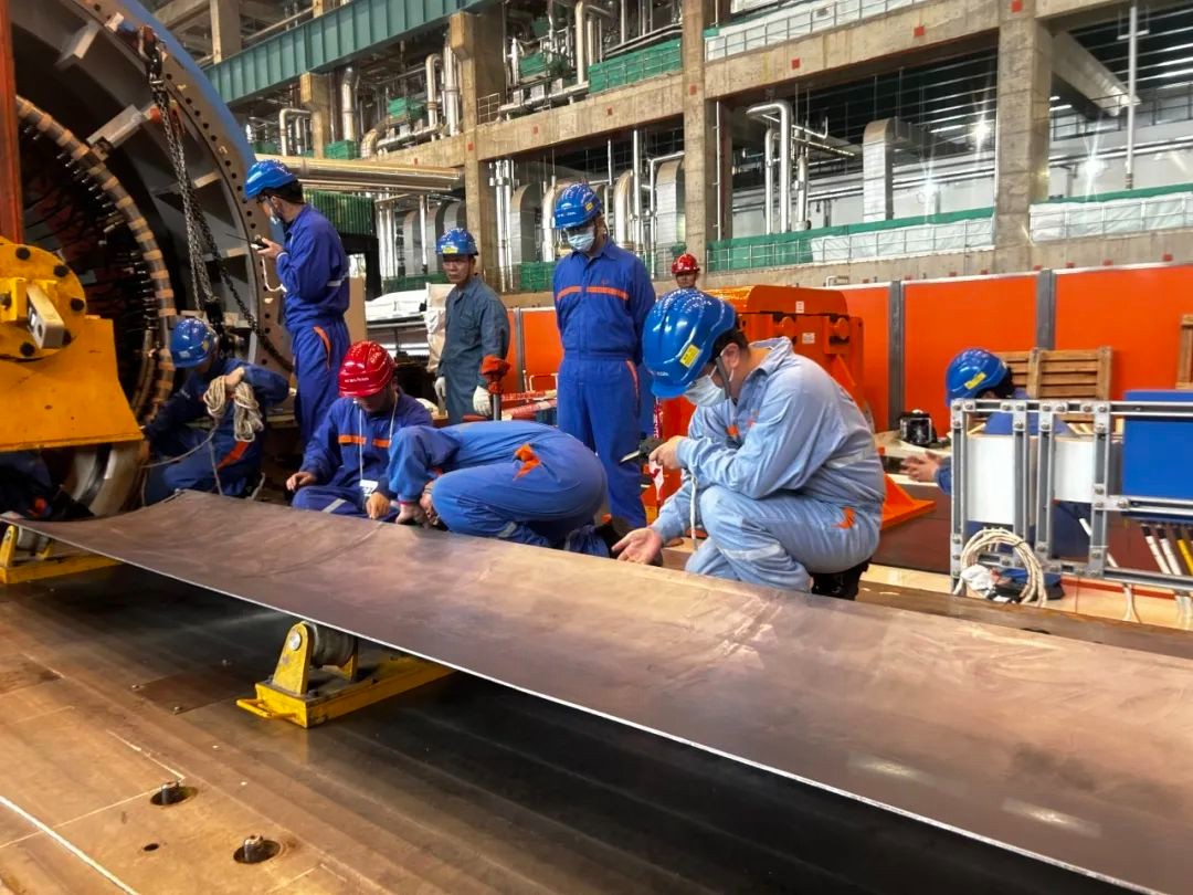 工作期間各專業(yè)始終堅(jiān)守現(xiàn)場(chǎng),隨時(shí)協(xié)調(diào)工作中可能出現(xiàn)的突發(fā)狀況,與起重班組保持緊密溝通,關(guān)鍵點(diǎn)控制、高崗監(jiān)護(hù)把控,確保每一個(gè)步驟都做到準(zhǔn)確無(wú)誤、安全可靠。最終經(jīng)數(shù)小時(shí)的努力鏖戰(zhàn),發(fā)電機(jī)轉(zhuǎn)子在單行車的牽引下完好無(wú)損地移出定子膛,穩(wěn)穩(wěn)地落在指定的專用支架上。