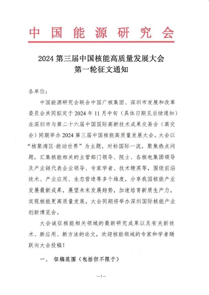 2024第三屆中國核能高質量發展大會第一輪征文通知