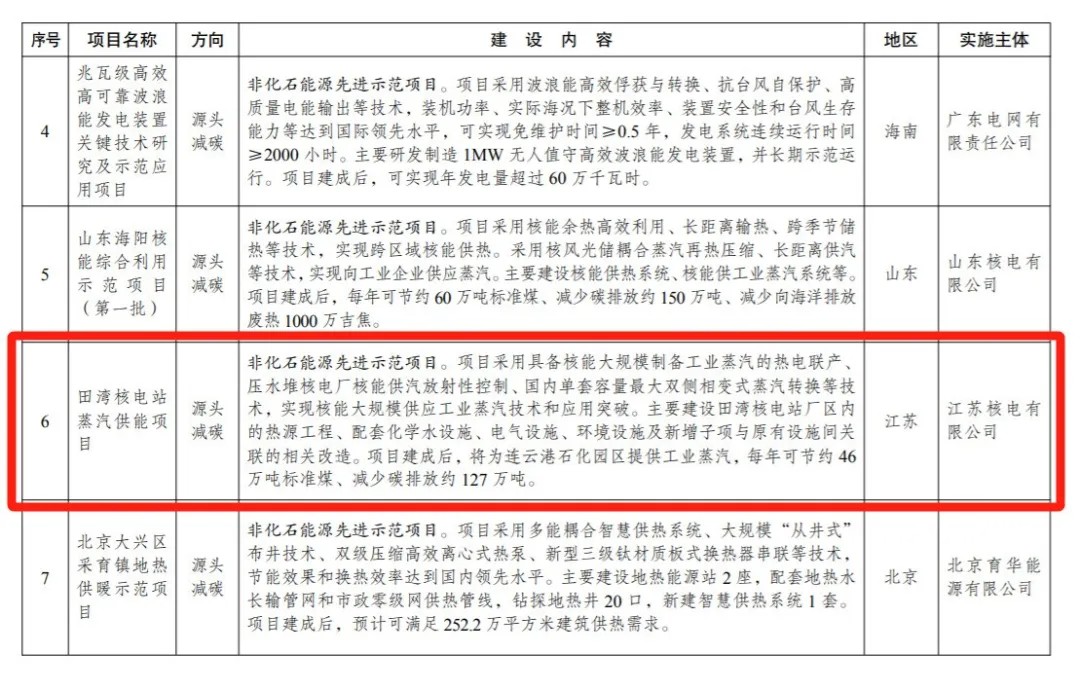 近日,國內首個大規模工業用途核能供汽示范工程——中核集團旗下中國核電控股的田灣核電站蒸汽供能項目成功入選國家發改委第一批“綠色低碳先進技術示范工程項目清單”。