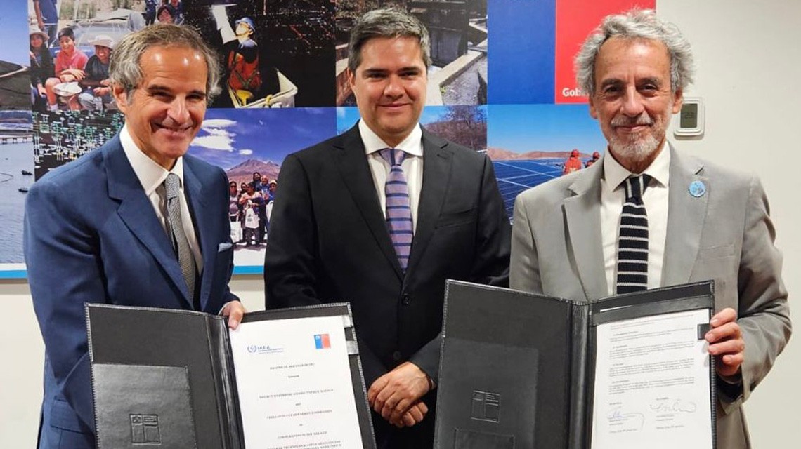 該協議由智利核能委員會(CCHEN)的路易斯·韋爾塔(Luis Huerta)簽署,并由智利能源副部長路易斯·費利佩·拉莫斯(Luis Felipe Ramos)見證。 (照片:國際原子能機構)格羅西先生說:“核科學促進了智利在健康、食品、安全和環境等領域的發展。我期待著進一步深化我們的合作。”