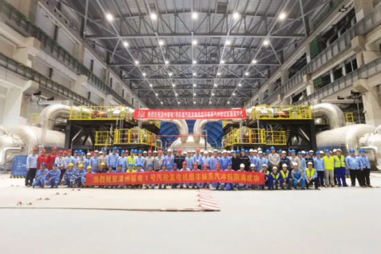 經過數日數夜的不懈努力,16日凌晨,在上海電氣保駕團隊、漳州業主、中核現場項目部以及安裝公司的共同見證下,汽輪機組在390轉速平臺暖機停留后,一舉沖至1500轉,圓滿完成了此次非核沖轉試驗,得到了客戶的高度贊揚,也為后續汽輪發電機組整體啟動及核蒸汽沖轉、首次并網及商運奠定了堅實的基礎。