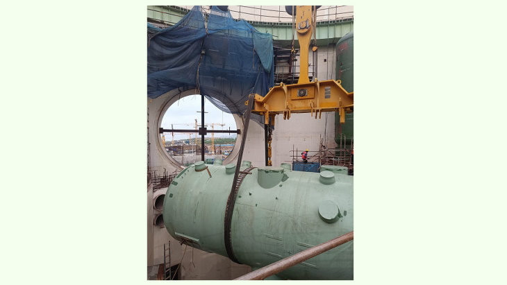 所有四臺蒸汽發生器(每臺直徑超過 4 米,長約 14 米,重 340 噸)均采用“開頂”方法安裝,這種方法首次用于庫丹庫拉姆 3 號機組。這種方法允許在反應堆圓頂關閉之前使用重型起重機將大型設備裝載到反應堆建筑物中。它可以大大縮短安裝時間。