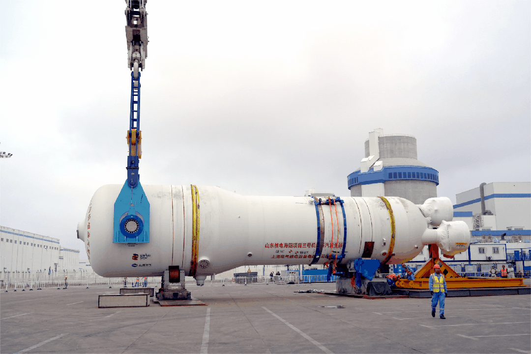 7月1日13時35分,海陽核電3號機組核島首臺蒸汽發生器順利吊裝就位。