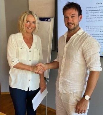隆德市市長(zhǎng) Gro Helleland(左)和 Norsk Kjernekraft 總工程師 Steffen Oliver Sæle 在簽字儀式后合影