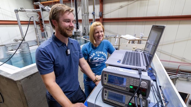 凱爾·里德 (Kyle Reed) 和黛安·埃澤爾 (Dianne Ezell) 在反應堆池中測試傳感器晶體管時收集數據