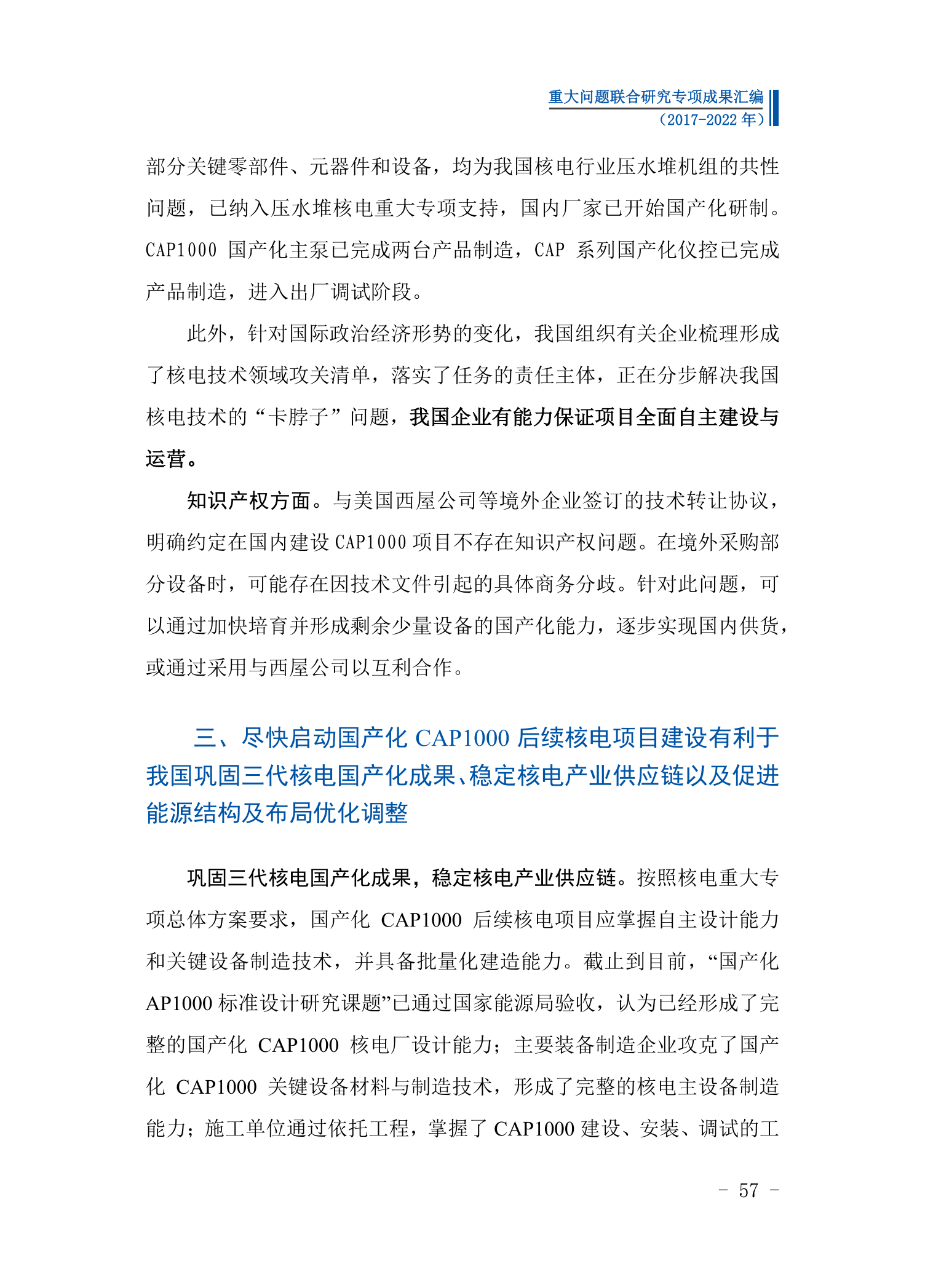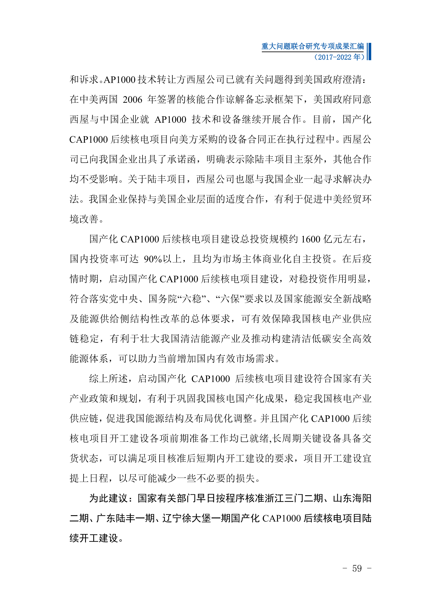 關于啟動國產化CAP1000后續核電項目建設的建議