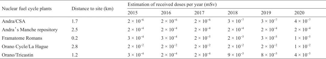 表1顯示了正常運(yùn)行期間法國(guó)核燃料循環(huán)設(shè)施的輻射影響。據(jù)估算,輻射劑量仍然很低,比天然輻射照射的年劑量低2~4個(gè)數(shù)量級(jí)。