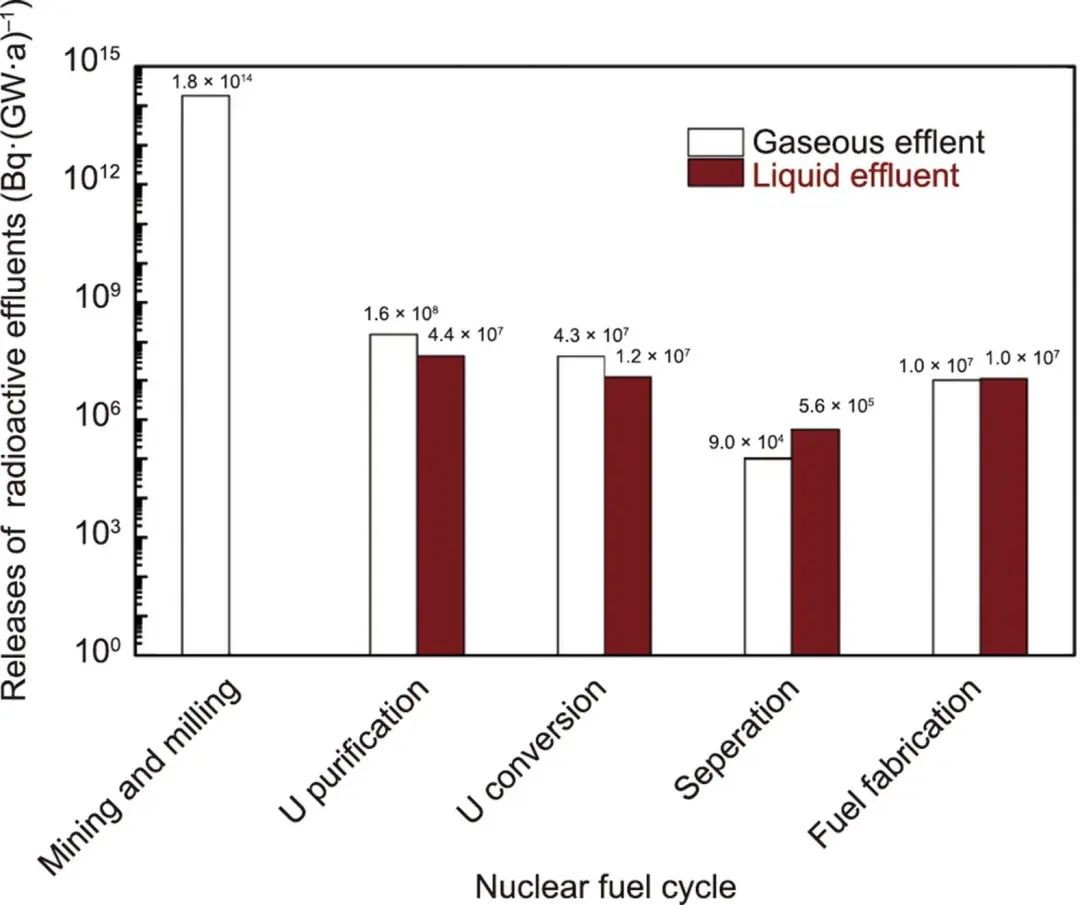 圖3 中國(guó)核燃料循環(huán)放射性流出物的平均排放量(2011—2013)。經(jīng)許可轉(zhuǎn)載自參考文獻(xiàn)。U:鈾。