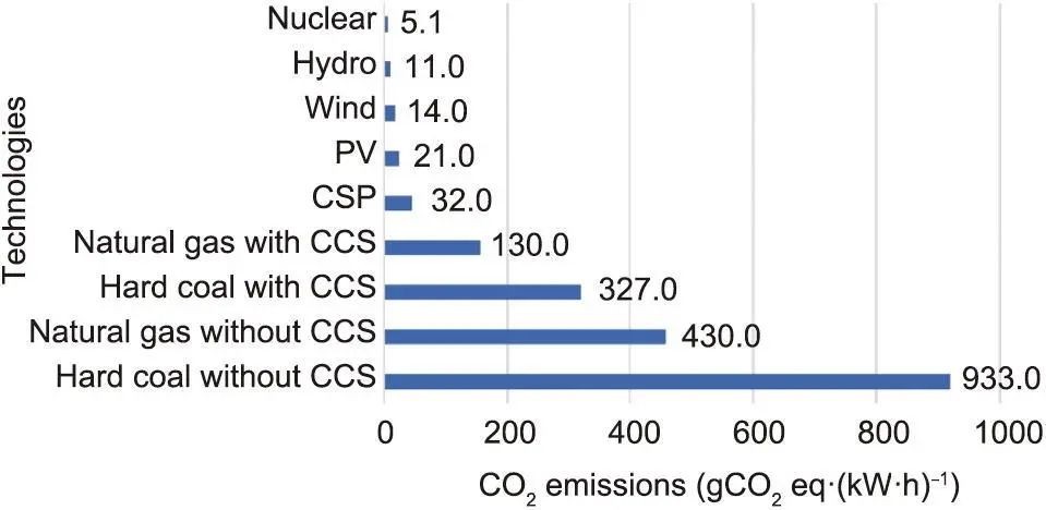 圖4 不同發(fā)電技術(shù)全生命周期CO2當(dāng)量排放量。按中值遞增排列[gCO2eq?kWh-1,即每千瓦時(shí)的CO2當(dāng)量排放量克數(shù)]。經(jīng)許可轉(zhuǎn)載自參考文獻(xiàn)。CCS:碳捕獲和封存;CSP:聚光太陽(yáng)能發(fā)電。