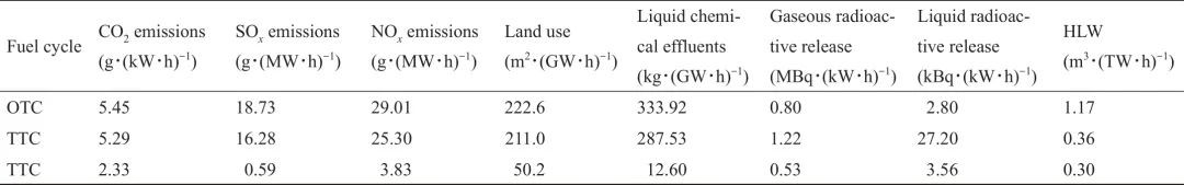 如果采用四代快中子反應(yīng)堆發(fā)電,如鈉冷快堆(SFR),由于取消了所有的前端循環(huán)操作,廢物釋放量和生成量將大幅減少。達(dá)到平衡狀態(tài)的SFR可以使用自身產(chǎn)生的乏燃料和額外的貧鈾運(yùn)行,并有可能燃燒次錒系元素。理論上講,钚和鈾的多次回收以及次錒系元素嬗變需要附加的乏燃料后處理步驟,可將HLW危害的持續(xù)時(shí)間從幾十萬(wàn)年縮短至幾百年。在法國(guó),已經(jīng)通過(guò)千克單位的小規(guī)模試點(diǎn)證明了提取次錒系元素的可行性。但只有當(dāng)四代快中子反應(yīng)堆趨于成熟后,才可能被擴(kuò)大到工業(yè)規(guī)模。研究表明,只有當(dāng)所有SFR都能嬗變錒系元素時(shí),才有可能發(fā)生次錒系元素的嬗變。快中子反應(yīng)堆基本上可燃燒貧化鈾,從而繞過(guò)燃料循環(huán)的前端(特別是鈾礦開(kāi)采),進(jìn)一步減少核能系統(tǒng)的環(huán)境足跡。根據(jù)法國(guó)核設(shè)施基地的全生命周期分析,表3進(jìn)行了不同方案的比較。
