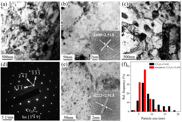 中國低活化馬氏體鋼(CLAM)因其良好的機械性能和相對成熟的制備技術被選為聚變堆包層的主要候選結構材料之一。馬氏體鋼的上限使用溫度通常為550℃,本研究中采用了氧化物彌散強化(ODS)方法以進一步提升其上限使用溫度。氧化物Y2Ti2O7是ODS鋼中常用的強化相,通常是將鈦(Ti)和三氧化二釔(Y2O3)與鋼基體粉末進行機械合金化,并在隨后的熱固結或熱處理過程中形成。然而,對于單獨添加Y2Ti2O7在ODS鋼制備過程中的結構演變和其對材料結構及性能影響機理尚不清楚。