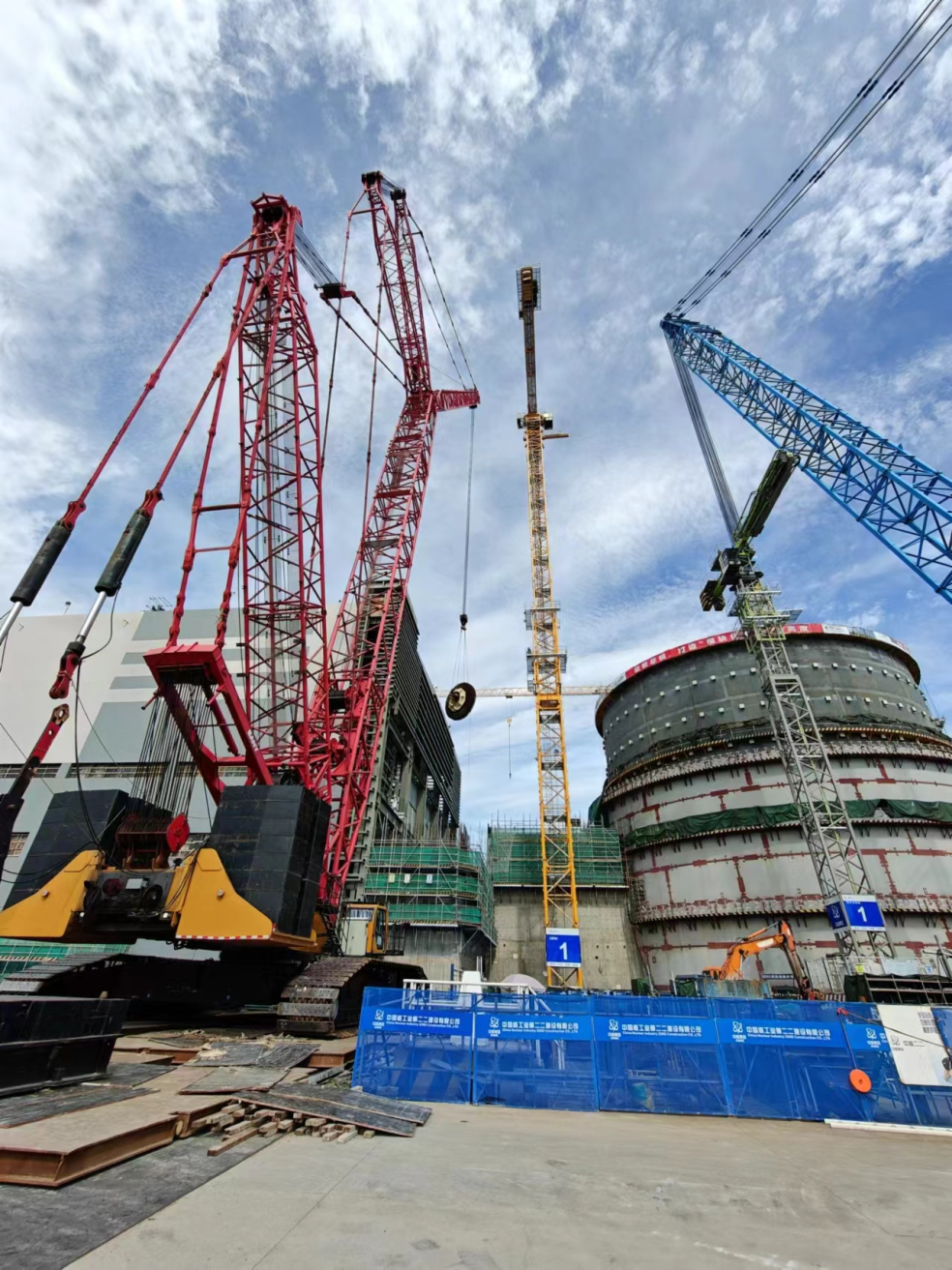 第一跨10.7米層墻體上預埋了兩組直徑1905毫米、總重約8噸的主蒸汽管道貫穿件套筒,該套筒周圍設有非常密集的環向筋及箍筋,重量達到14噸。項目團隊積極踐行CAP1000機組“應模盡模”的理念,在地面上將貫穿件套筒與周圍鋼筋提前進行了綁扎與固定,隨后采用履帶吊對該土建模塊進行整體吊裝,不僅提高了密集鋼筋的施工質量、節省了施工時間,還降低了現場狹窄作業面下鋼筋綁扎的安全風險。
