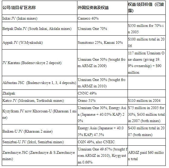 三是TENEX與Akbastau和Karatau成立鈾勘探和開采合資公司,這三家企業股權后被鈾壹公司(Uranium One,U1H)收購,U1H公司總部位于加拿大,目前是俄羅斯在哈所有開采權益和制酸廠權益的控股公司。