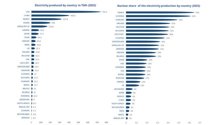 2023 年,中國(guó)連續(xù)第四年超過(guò)法國(guó),成為世界第二大核能生產(chǎn)國(guó),盡管核電規(guī)模較小。2023 年,中國(guó)核電發(fā)電量為 406 TWh。到 2023 年底,美國(guó)仍然是世界核電生產(chǎn)領(lǐng)先者,93 座運(yùn)行中的反應(yīng)堆發(fā)電量為 779.2 TWh,約占全球核電發(fā)電量的 31%。2023 年,沃格特勒 3 號(hào)機(jī)組于 2023 年 7 月 31 日投入商業(yè)運(yùn)營(yíng),成為該國(guó) 30 多年來(lái)第一座投入運(yùn)營(yíng)的新核反應(yīng)堆。 (沃格特勒 4 號(hào)機(jī)組于 2024 年 4 月 29 日投入商業(yè)運(yùn)營(yíng),使美國(guó)反應(yīng)堆總數(shù)達(dá)到 94 座,總?cè)萘窟_(dá)到 97 GWe。)截至 2023 年底,法國(guó)運(yùn)營(yíng) 56 座核反應(yīng)堆,總?cè)萘繛?61.4 GWe,發(fā)電量為 323.8 TWh。
