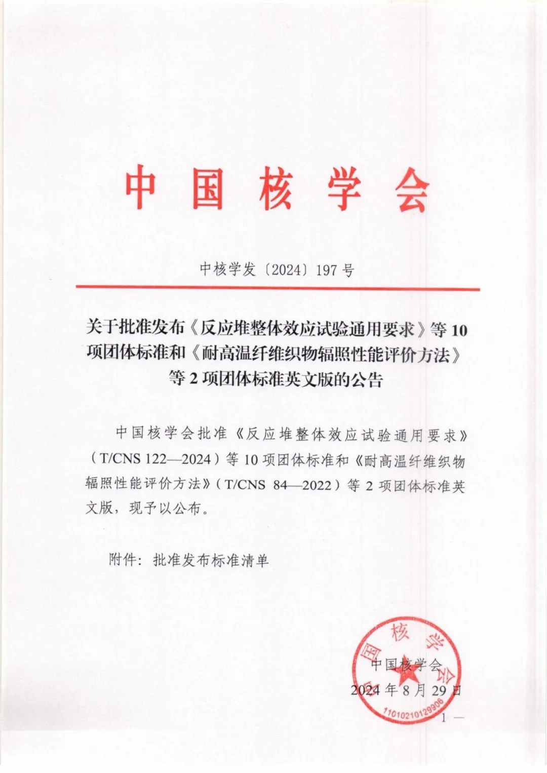 中國核學會批準《反應堆整體效應試驗通用要求》(T/CNS122-2024)等10項團體標準和《耐高溫纖維織物輻照性能評價方法》(T/CNS842022)等2項團體標準英文版,現予以公布: