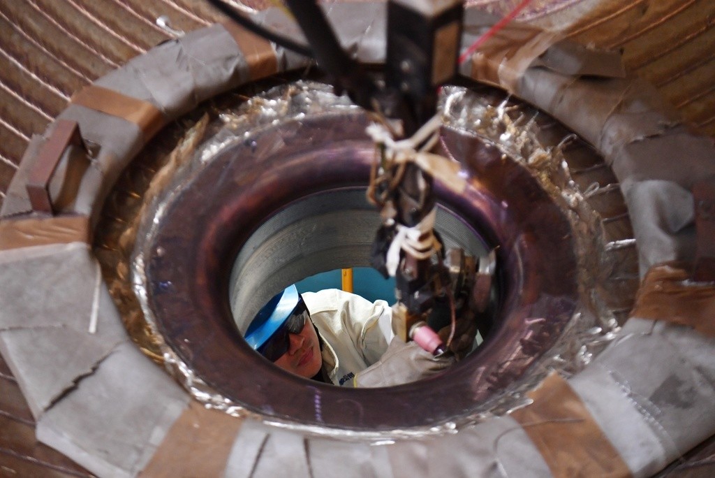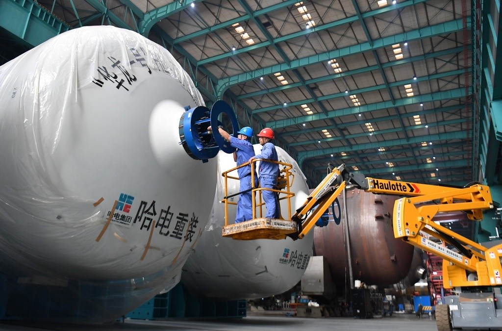 圖為工作人員對(duì)生產(chǎn)完成的“華龍一號(hào)”蒸汽發(fā)生器進(jìn)行巡查。