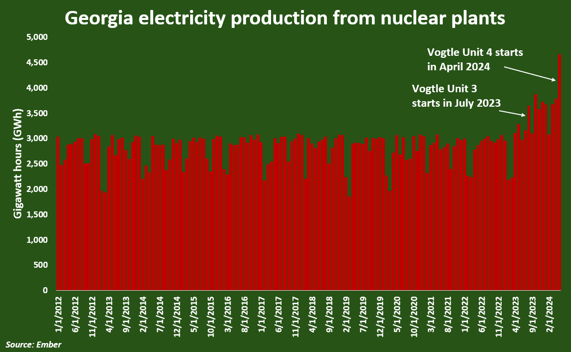 Ember 的數據顯示,前兩臺反應堆于 20 世紀 80 年代末投入生產,2012 年至 2022 年間將產生佐治亞州約 27% 的電力。