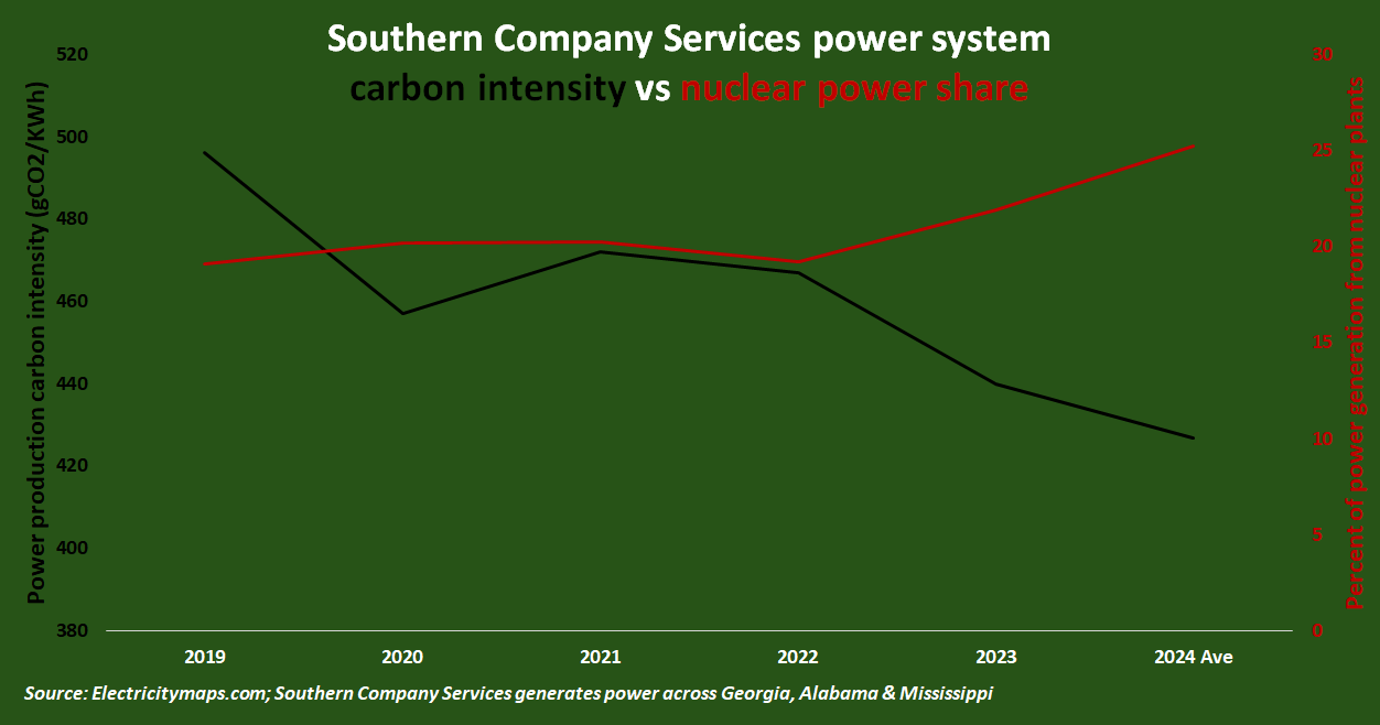 佐治亞州核能發電量的增加反過來又幫助削減了南方服務電力系統的發電碳強度,該系統為佐治亞州、阿拉巴馬州和密西西比州部分地區提供電力。