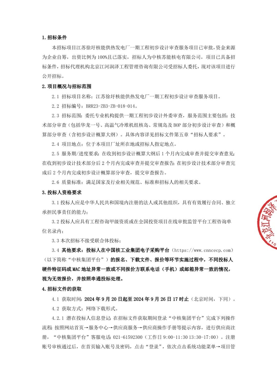 招標范圍:委托專業機構提供一期工程初步設計外委審查,服務范圍主要包括:技術部分審查(包括華龍一號、高溫氣冷堆機組核島、常規島及 BOP 部分初步設計審查)和概算部分審查(含初步設計概算大綱)。