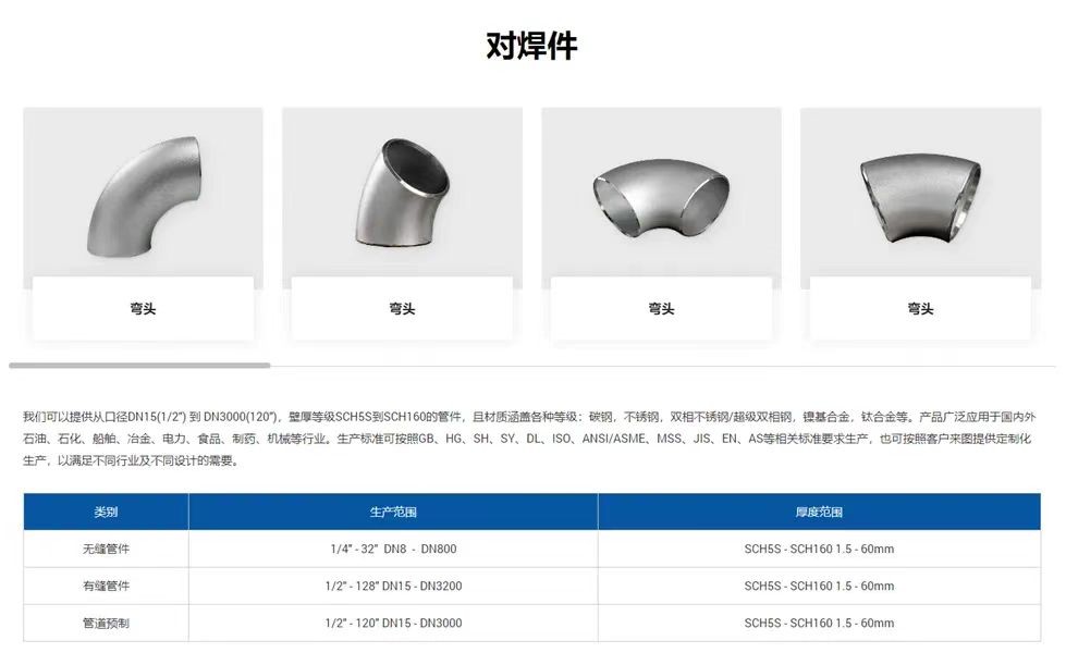 我們可以提供從口徑DN15(1/2") 到 DN3000(120"),壁厚等級SCH5S到SCH160的管道預制,且材質涵蓋各種等級:碳鋼,不銹鋼,雙相不銹鋼/超級雙相鋼,鎳基合金,鈦合金等。產品廣泛應用于國內外石油、石化、船舶、冶金、電力、核能、食品、制藥、機械等行業。生產標準可按照GB、HG、SH、SY、DL、ISO、ANSI/ASME、MSS、JIS、EN、AS等相關標準要求生產,也可按照客戶來圖提供定制化生產,以滿足不同行業及不同設計的需要。