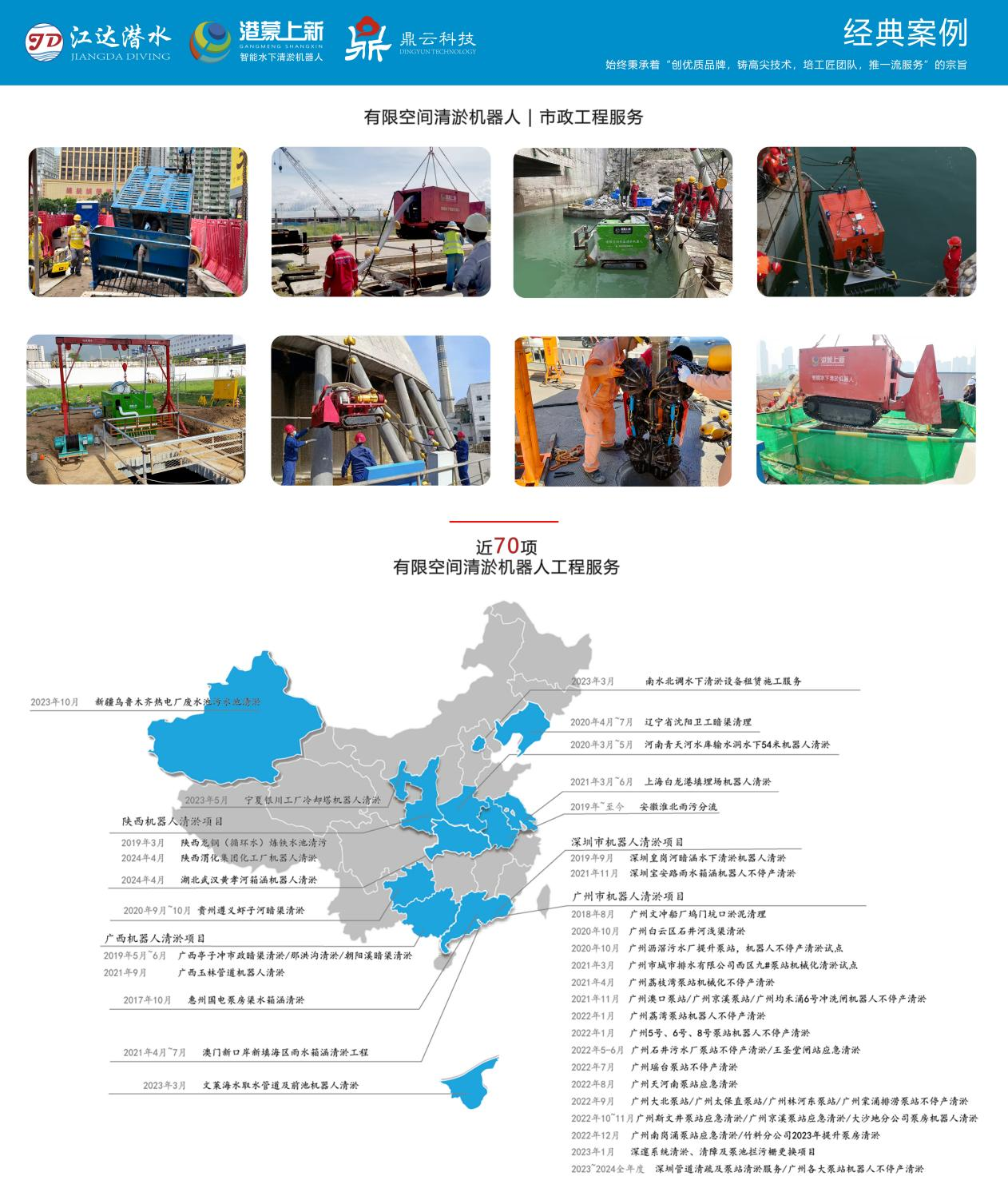 廣州市江達潛水疏浚工程有限公司成立于2006年,是一家專業從事水下工程服務和研發制造水下機器人的綜合性高新技術企業。2019年被中國潛水打撈行業協會授予潛水服務能力與信用評估二級證書;有限空間清淤機器人已經在70多個項目上完成施工,在2 0 2 0年獲得中汽檢測產品認證的產品合格證書和符合歐盟法律法規相關安全標準及允許進入歐盟及歐洲貿易自由區國家市場的CE認證證書。2021年入庫國家科技型中小企業,被評為“2023年上半年創新型中小企業”,2023年獲得專精特新認證。