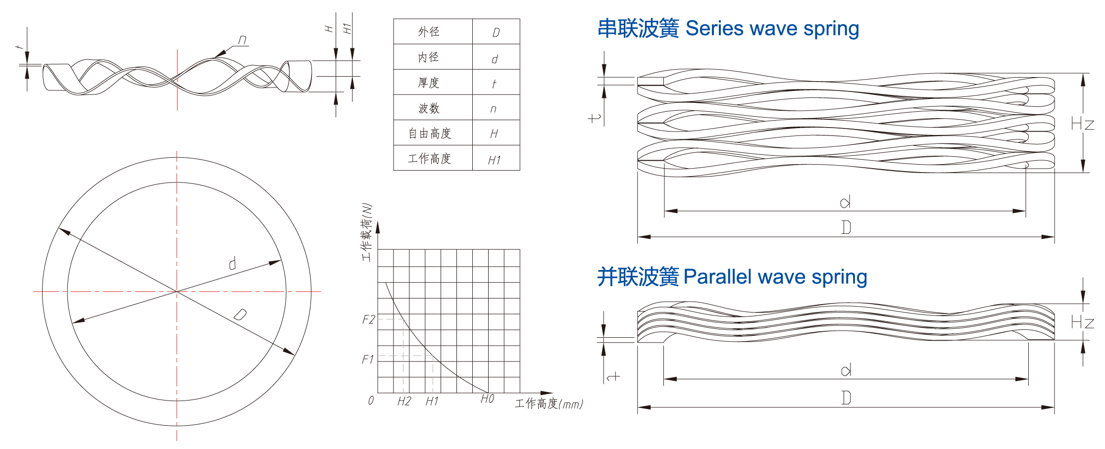【產品描述】: 波形彈簧簡稱波簧,在金屬圓環上加工有若干峰谷的彈性元件。本公司生產的波形彈簧分單層(開口、閉口)波形彈簧、多層波形彈簧。單層波形彈簧可執行標準為JB/T 7590-2005,HG/T 2479-2003,也可代為設計、制造各類非標準波形彈簧。鑒于國內沒有統一的多層波形彈簧標準,公司可根據客戶要求生產或代為客戶設計、制造各類多層波形彈簧。