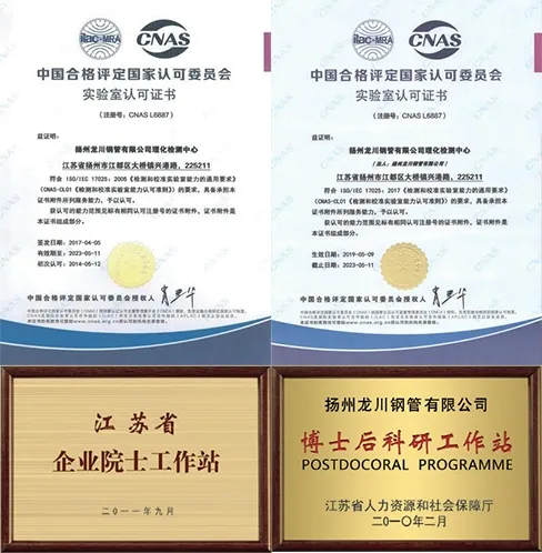 龍川能源一直貫徹運行國際先進的質量控制與質量保證體系,始終堅持持續改進的產品質量理念和獲得TUV ISO9001質量管理體系認證、ISO14001環境管理體系認證、OHSAS18001健康安全體系認證;公司獲得國家TS認證(A1、A2(1)(2)、B(1)(2)級),通過API5CT、API5L、PED、CPD、CPR、AD2000國際產品質量認證及DNV-GL、LR、BV、ABS、CCS等多國船級社的工廠認證。