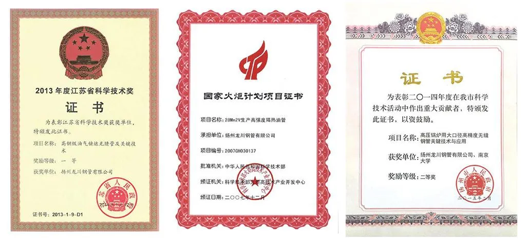 龍川能源以產品技術創新為核心驅動力,始終堅持年技術研發投入不低于10% 的增長率 ,先后建立了國家級的無縫鋼管理化檢測中心并取得CNAS證書,建設了自己的腐蝕試驗檢測中心、新品研發中心,聯合國內外知名院所建立服務企業的博士后科研工作站、企業院士工作站,堅持以推動無縫鋼管行業技術革新為己任,在無縫鋼管技術領域始終追求領先優勢。公司研發的新型海底管線產品榮獲江蘇省科技進步一等獎。大口徑無縫鋼管多項自主知識產權獲得于江蘇省科技成果轉化項目大力支持。