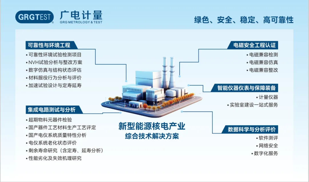 廣電計量是廣州數字科技集團旗下高科技上市企業,創立于2002年,是國內領先的國有第三方計量檢測上市企業,面向特殊裝備、航空及低空經濟、智能網聯汽車、數字經濟、新能源及核電等國家戰略性產業領域,構建了“計量檢測+科研服務+評價咨詢+規劃設計+認證”一站式綜合技術服務能力,其中計量校準、可靠性與環境工程、電磁兼容檢測業務的經營規模和服務能力居行業前列。在核電領域,廣電計量圍繞國家能源戰略,聚焦核電產業上下游需求,構建了設備原材料、元器件及零部件的環境應力篩選、可靠性試驗與壽命評估、電磁兼容、仿真分析等綜合技術服務能力,在核島、常規島的關鍵設備上的檢測業務持續突破,助力核電產業綠色、安全、高質量發展。