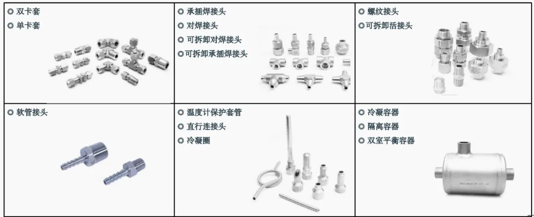 (2)目前我司制造的管件品類有:卡套接頭、焊接接頭、螺紋接頭、軟管接頭、溫度計(jì)保護(hù)套管、輔助容器等。
