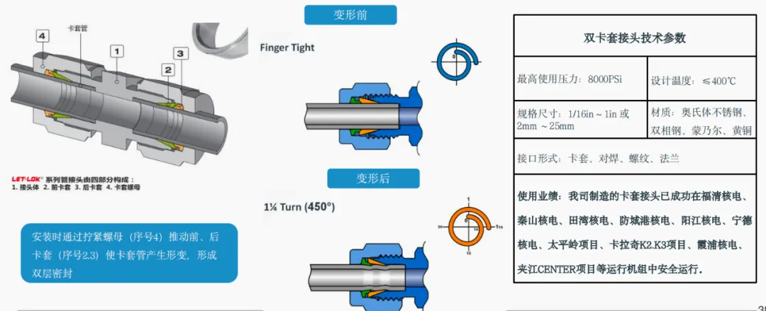 雙卡套接頭因密封效果好、拆卸方便、 可重復(fù)安裝、維護(hù)成本低等特點(diǎn),廣泛運(yùn)用在石化、核電、氫能源等儀控管路中。