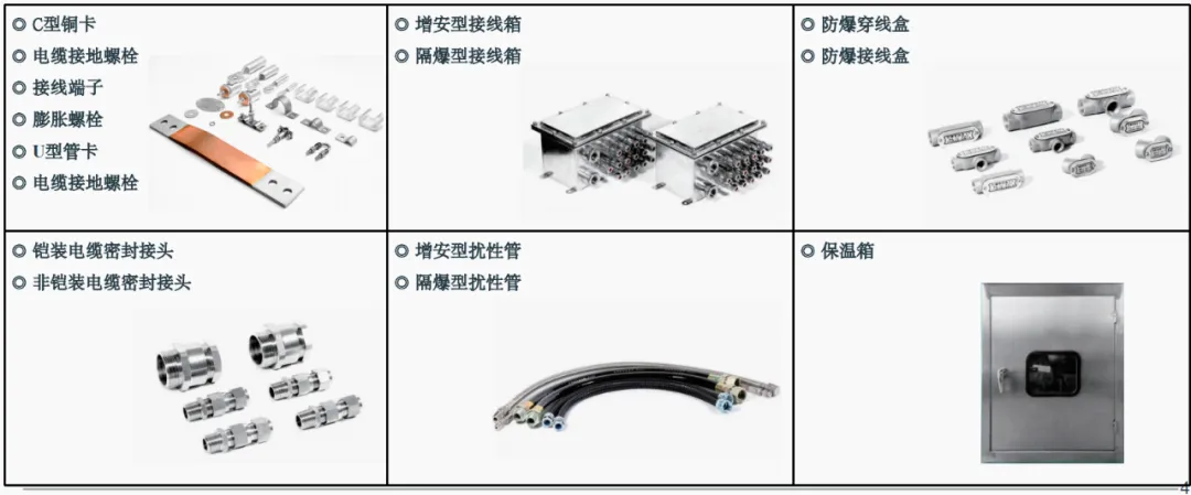 (3)目前我司制造的防爆電氣品類有:接地件、接線箱、穿線盒、電纜密封接頭、擾性管、保溫箱等