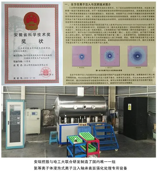 經杭州試驗中心測試,經離子注表面處理的軸承壽命可達12L10以上。目前實況使用壽命1200小時以上,是進口軸承壽命的3倍左右,完成了出口替代。