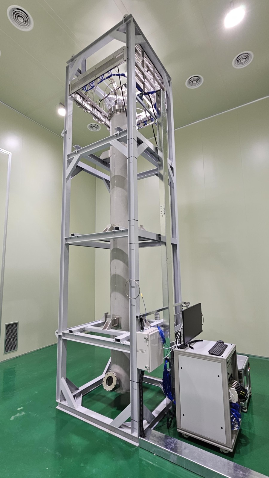 照片 2. 組裝前的罐和模擬核燃料組件(高度 4.8m)照片 3. 安裝在韓國(guó)原子能研究所大型恒溫恒濕室中的模擬乏核燃料干罐熱試驗(yàn)裝置。