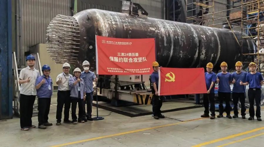 由東方電氣(廣州)重型機(jī)器有限公司承制的穩(wěn)壓器肩負(fù)著維持冷卻劑系統(tǒng)壓力穩(wěn)定的重任,重量達(dá)139噸,是保障核電站安全運(yùn)行的核心設(shè)備。穩(wěn)壓器的主要結(jié)構(gòu)包括電加熱器、噴淋裝置、安全閥、排氣閥和嚴(yán)重事故泄壓閥。穩(wěn)壓器中有電加熱器108根,公司發(fā)揮技術(shù)優(yōu)勢(shì),連續(xù)突破了多個(gè)關(guān)鍵技術(shù)壁壘,通過(guò)聯(lián)合研發(fā)化解了“卡脖子”風(fēng)險(xiǎn),通過(guò)系統(tǒng)分析找到電加熱器套管和下封頭焊接變形、起弧和收弧缺陷打磨的根本原因,確保精密組件在與下封頭焊接時(shí)變形可控,實(shí)現(xiàn)所有電加熱器套管PT一次合格。