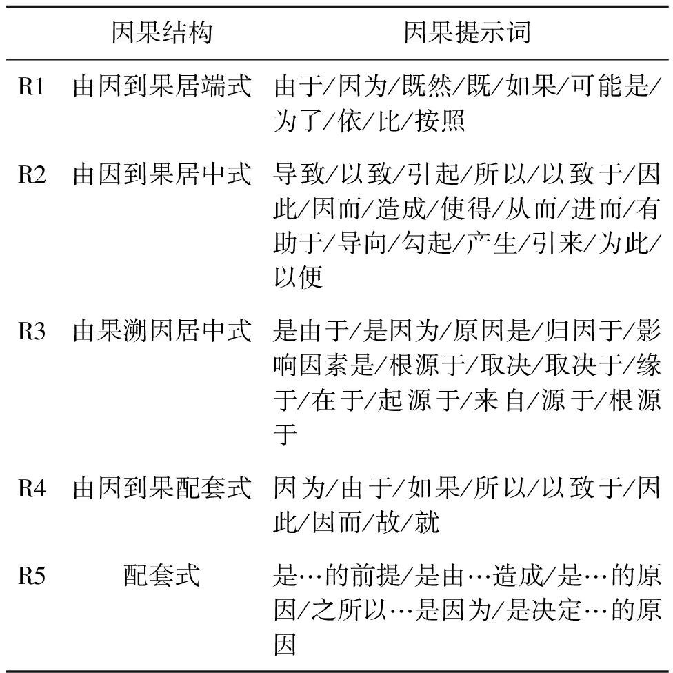 在報告整合的基礎上,本文事件抽取主要包括事件觸發詞檢測和事件判定兩個步驟[14]。首先,采用自然語言處理技術進行文本預處理,對核電運行事件報告進行文本的清洗和過濾,切割為以詞語為單位的文本集合。利用Hanlp進行詞性分析,判斷是否為事件觸發詞。其中若句子中包含表1中所示的因果提示詞類觸發詞,則該句子為顯式因果句,按照顯式因果關系抽取的方法抽取其中的因果關系事件對[15]。