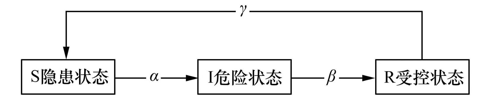 結合核電致因網絡中各個事件節點的變化特性,將其分為三種狀態:隱患狀態、危險狀態、控制狀態[20]。潛在的隱患狀態節點通過與其他節點不斷地接觸,產生被傳染的概率,即網絡中存在的風險感染率α。設間隔時間t內所有可能發生接觸的節點數為S(t)I(t),則實際發生傳染的節點數為αS(t)I(t),這部分代表隱患狀態節點減少的數量與危險狀態節點增加的數量。同理受到恢復率的影響,同一時間內危險節點數減少βI(t),這部分節點進入受控狀態。在此基礎上引入的免疫缺陷率γ使得有γR(t)個受控狀態節點在間隔時間t內重新變為隱患狀態。