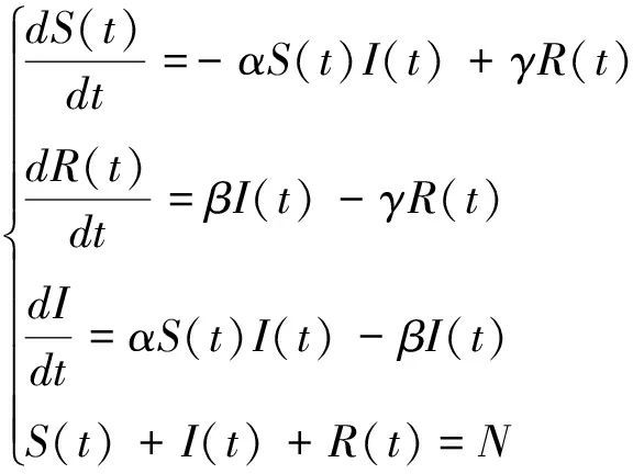SIR模型規定了三種狀態的人,包括健康狀態、感染狀態和免疫狀態[11]。其中S代表處于健康狀態的人群,I代表已感染的人群,R代表免疫人群,見圖1。根據SIR模型做如下假設: