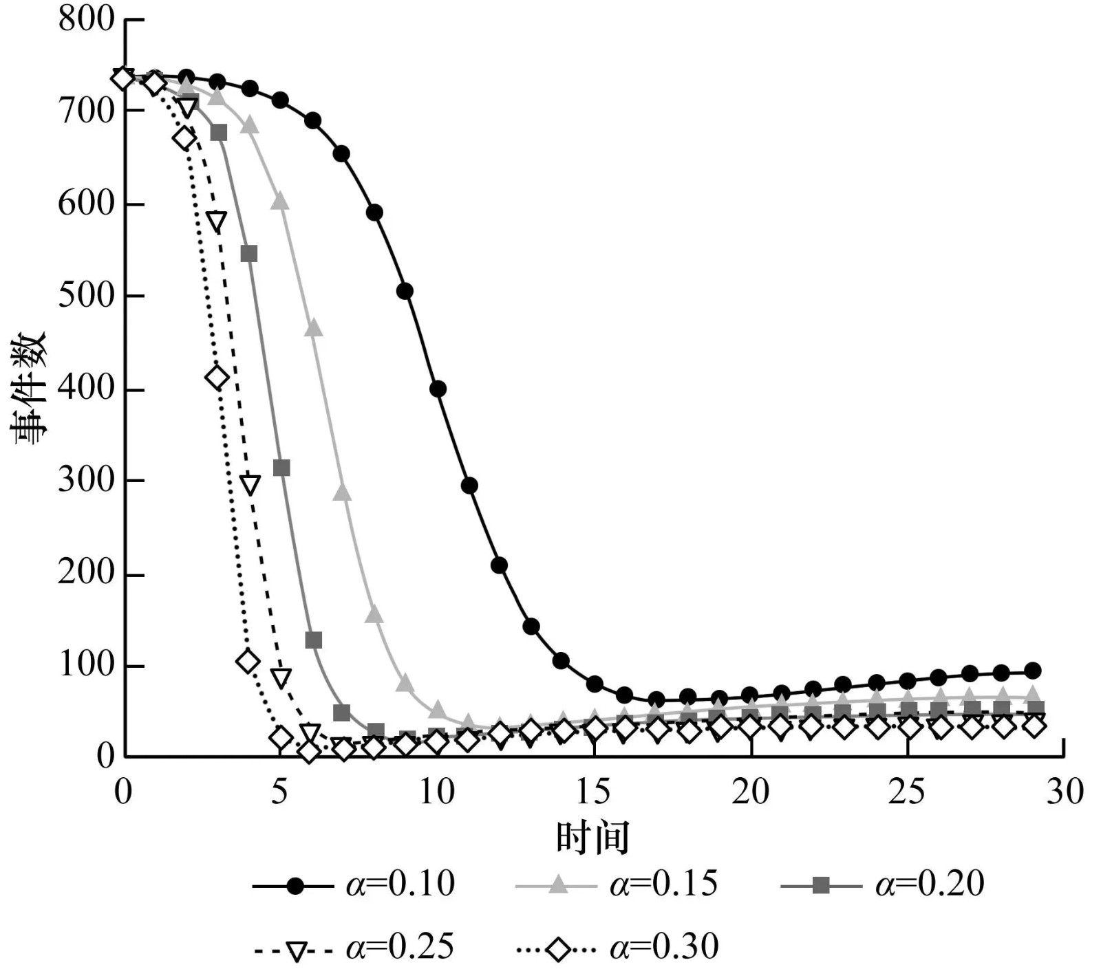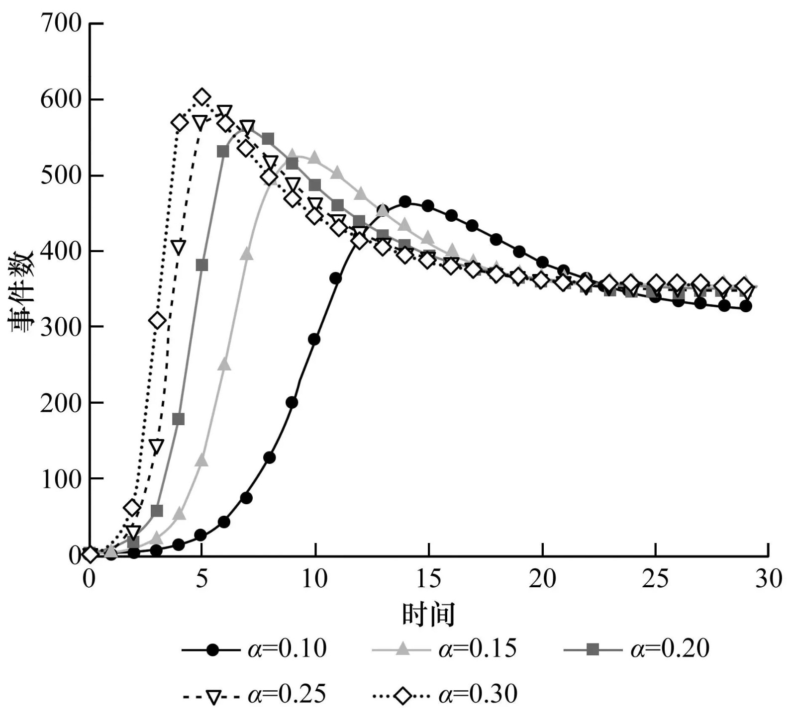 危險狀態事件數的具體變化為,當α=0.10時,在t=14時達到極大值464。當α=0.15時,在t=9時達到極大值527。當α=0.20時,在t=7時達到極大值564。當α=0.25時,在t=6時達到極大值589。當α=0.30時,在t=5時達到極大值608。與之前不同的是,感染率的降低不僅降低了穩態內危險狀態事件數量,同時增加了系統達到最終穩態水平所需的時間。綜上可知,風險感染率與核電系統安全呈負相關,感染率越大,核電安全越難以控制,且危險狀態下的節點變化速度更大,數量更多。