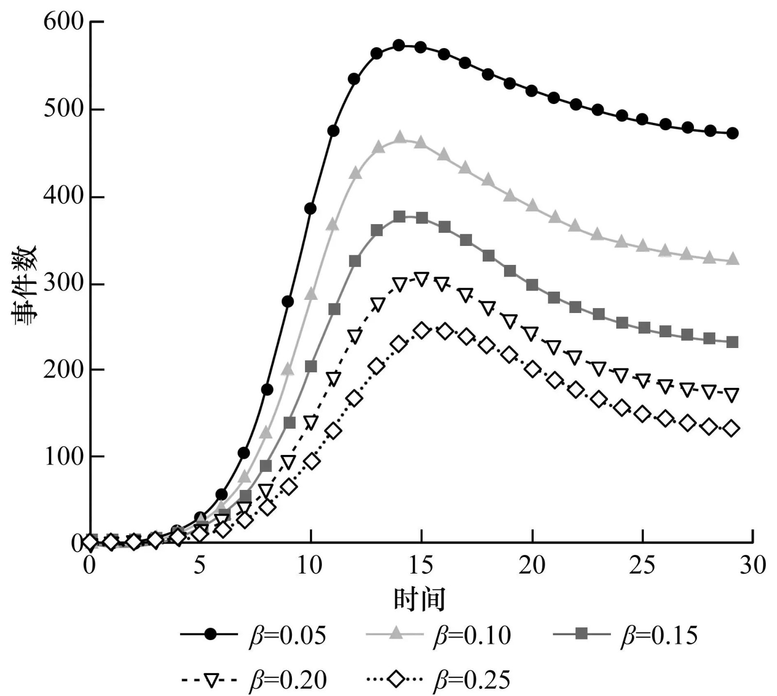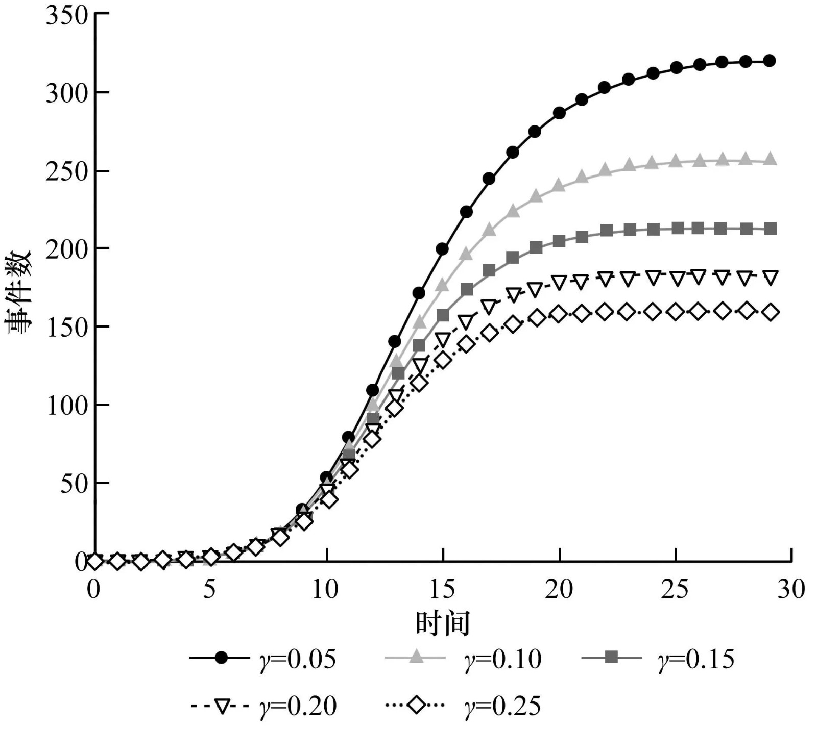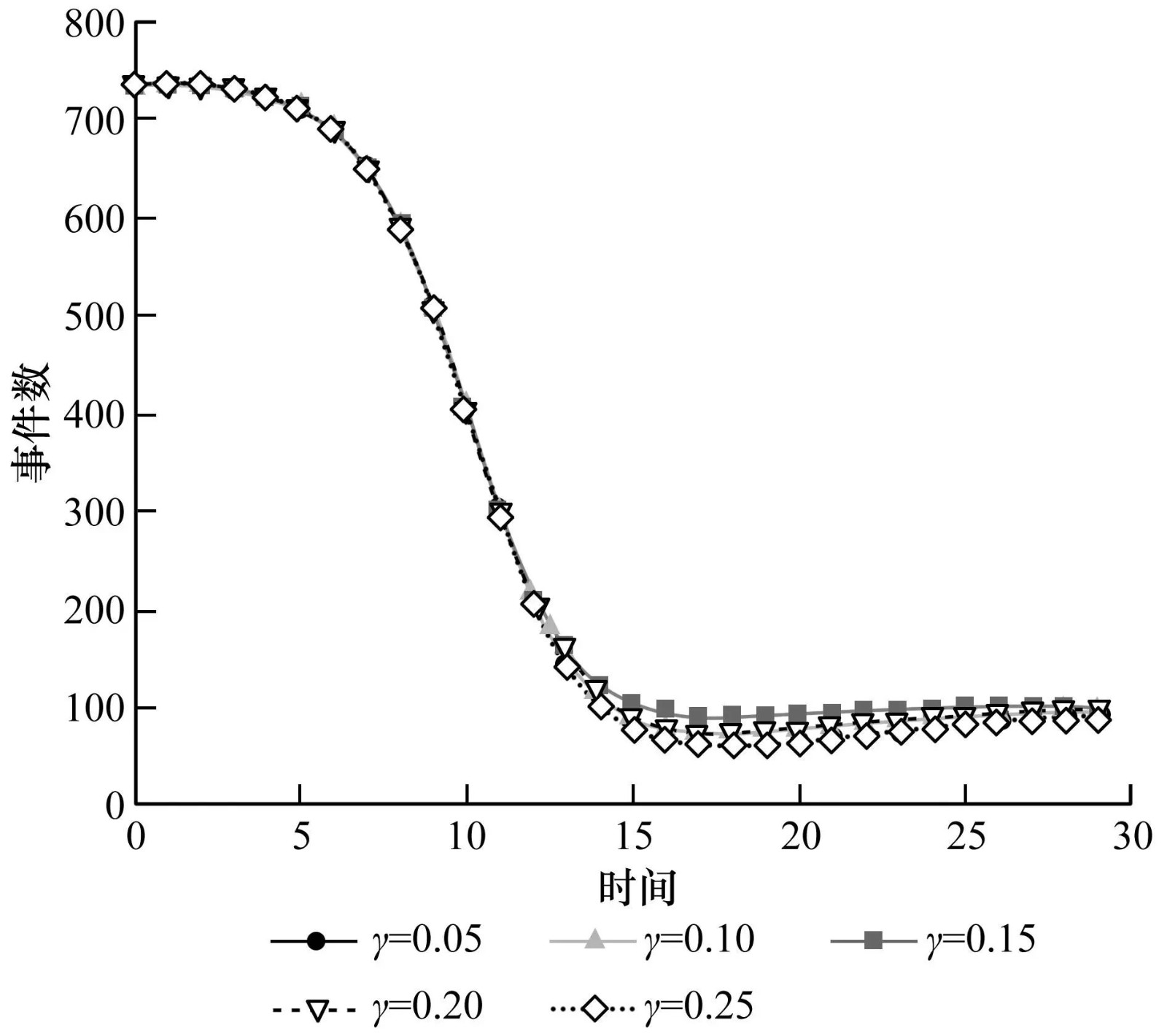 由仿真可得出,當α=0.10時,隱患狀態事件數在t=18時達到極小值61。當α=0.15時,隱患狀態事件數在t=12時達到極小值32。當α=0.20時,隱患狀態事件數在t=9時達到極小值20。當α=0.25時,隱患狀態事件數在t=8時達到極小值14。當α=0.30時,隱患狀態事件數在t=6時達到極小值10。分析數據變化可知,感染率對風險傳播速度和高度的作用較為顯著。隨著α的增大,系統受到的風險沖擊更大,隱患狀態事件數量下降得更快。系統的感染率越大,那么當危險發生時,留給操縱員用來反應事件的時間越短,此時核電系統的安全可控性越差。