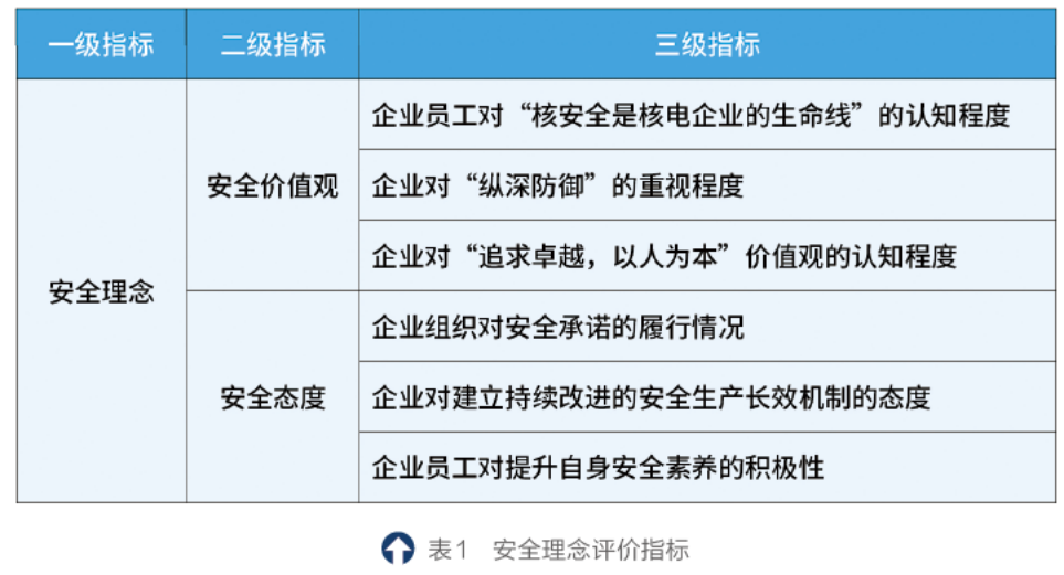 核電施工單位應從核電項目施工質量安全相關的事件、法律法規遵守、程序文件有效性等方面考慮,并結合核安全文化的總體特征,列出能夠明顯影響安全文化的因素,自上而下,得到施工單位、各部門乃至各施工班組的核安全文化指標。對每個指標的權重進行分析和篩選,以每年度的改進目標為準繩,定期進行計算,得出每個指標的指數。通過對指數的分析,查找出本階段核安全文化建設中哪些方面存在不足,進行趨勢分析和提出糾正行動。廣東核電安全文化評價指標分為三級,根據指標的重要程度賦予不同的分數和權重,通過對三級指標的評價,統計分析得出一級指標的效果評價。表1以廣東核電安全文化中安全理念評價指標為例,以供借鑒和學習。