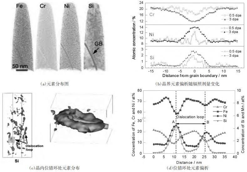 奧氏體不銹鋼材料受輻照后,晶界處常發(fā)生貧 Cr 富 Ni 和 Si 的元素偏析。圖 2a 給出了核用 304 不銹鋼 經(jīng) 2 MeV 質(zhì)子輻照后晶界偏析的三維原子探針分析。輻照偏析與輻照劑量在一定范圍內(nèi)存在正相關(guān)關(guān)系 (圖 2b),并且材料因素(如合金成分、冷變形、熱處理 等)影響。如 Allen 等觀察到在多數(shù)奧氏體不銹鋼中出 現(xiàn)晶界貧 Fe 現(xiàn)象,但當(dāng) Ni 和 Cr 的含量比值較低使得 晶界處富 Ni 量少于貧 Cr 量時(shí),也會(huì)出現(xiàn)富 Fe 現(xiàn)象。另 一方面,在晶粒內(nèi)部位錯(cuò)環(huán)等缺陷處,Jiao 和 Deng 等[5- 6] 也發(fā)現(xiàn)類似晶界處的元素偏析(圖 3c),都是貧 Fe、 Cr 和富 Si、Ni,且 Fe、Cr 和 Ni 在位錯(cuò)環(huán)處的偏析程度與 晶界處相近,而 Si 在位錯(cuò)環(huán)處的偏析程度則數(shù)倍于晶 界處。位錯(cuò)環(huán)處成分偏析到一定程度滿足形成相的成 分條件時(shí)有可能形成新相。事實(shí)上,已有發(fā)現(xiàn)在高劑量 輻照不銹鋼中發(fā)現(xiàn)位錯(cuò)環(huán)處析出了 γ'- Ni3Si 相。輻照偏 析及輻照誘發(fā)第二相的析出對材料性能產(chǎn)生不利影 響。如晶界貧 Cr 使得晶界的腐蝕抗力降低,會(huì)促進(jìn)沿晶SCC 的發(fā)生。輻照誘發(fā)的 γ'- Ni3Si 相將大量的 Ni 和 Si 從基體中剝奪,基體中 Ni 含量的降低會(huì)改變材料層錯(cuò) 能,導(dǎo)致材料變形性能劣化。