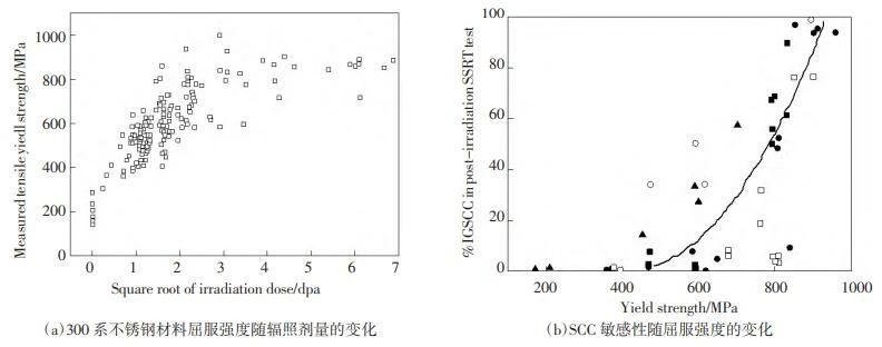 輻照硬化實(shí)質(zhì)是輻照后產(chǎn)生的大量微觀尺寸缺陷 如位錯(cuò)環(huán)和空洞等對位錯(cuò)的釘扎作用阻礙位錯(cuò)線的滑 移,進(jìn)而使材料發(fā)生硬化。輻照硬化值與位錯(cuò)環(huán)等缺陷 的尺寸和數(shù)量密度緊密相關(guān)。如彌散障礙硬化模型認(rèn) 為,輻照硬化值(ΔH)與位錯(cuò)環(huán)數(shù)量密度(N)和直徑(d) 乘積值的平方根((Nd)0.5)成正比。也有研究表明[7] ,輻 照形成的原子團(tuán)簇和基體間模量不協(xié)調(diào)造成的模量失 諧同樣也會(huì)引起材料的硬化。硬度值增加會(huì)增加材料 的屈服強(qiáng)度,源硬化模型認(rèn)為,屈服強(qiáng)度的增加同樣受 位錯(cuò)環(huán)的數(shù)量密度與尺寸影響,并與輻照劑量的平方 根呈線性關(guān)系,如圖 3a 所示。另一方面,屈服強(qiáng)度增加 會(huì)促進(jìn) SCC 的發(fā)生(圖 3b)。