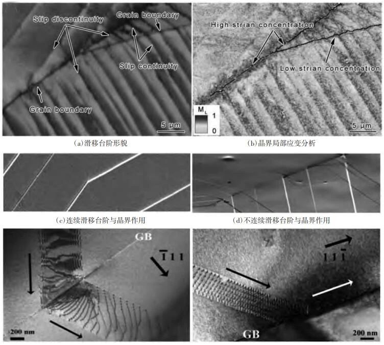 輻照硬化是影響材料 IASCC 敏感性的另一個(gè)重要因素。材料受輻照后產(chǎn)生大量微觀尺度的位錯(cuò)環(huán)、空洞 等缺陷團(tuán)。在應(yīng)力 / 應(yīng)變作用下,這些缺陷團(tuán)造成位錯(cuò) 運(yùn)動(dòng)受阻使材料力學(xué)性能發(fā)生劣化。研究表明,300 系 不銹鋼在 300℃左右輻照后,隨著輻照劑量的增加,屈 服強(qiáng)度增加,塑性和斷裂韌性下降。材料屈服強(qiáng)度增加 后易發(fā)生非均勻局部變形,局部變形促使材料表面形 成滑移臺階(圖 5a)。這些滑移臺階穿過或終止于晶界, 終止于晶界的臺階造成晶界處產(chǎn)生不連續(xù)滑移,易將 位錯(cuò)傳輸?shù)骄Ы?圖 5c),在晶界區(qū)域形成位錯(cuò)塞積和 殘余應(yīng)變集中(圖 5b)。當(dāng)應(yīng)變集中超過某一臨界應(yīng)變 值后,晶界發(fā)生開裂。Deng 等[9] 研究結(jié)果表明,晶界處 殘余應(yīng)變集中程度隨輻照劑量增加而增加,因此材料 的 IASCC 敏感性也隨輻照劑量增加而增加。另一方面, 輻照硬化也會(huì)影響 IASCC 的擴(kuò)展速率。對 304 不銹鋼 的研究表明,輻照致屈服強(qiáng)度的增加會(huì)使 IASCC 裂紋 擴(kuò)展速率以指數(shù)形式增加。