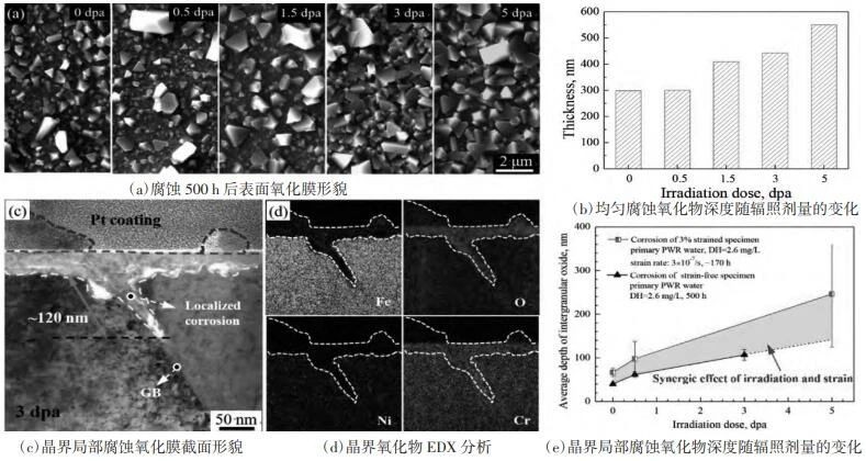 Deng 等[10] 采用 2MeV 質(zhì)子束在 360℃對固溶態(tài)核 用 304 不銹鋼試樣輻照后,系統(tǒng)研究了輻照對腐蝕行 為的影響。發(fā)現(xiàn)輻照同時(shí)促進(jìn) 304 不銹鋼的均勻腐蝕 和晶界局部腐蝕(圖 6)。試樣表面形成的氧化膜厚度和晶界處局部腐蝕深度均隨輻照劑量增加而增加。特別 地,通過對比應(yīng)變與無應(yīng)變作用下的晶界局部腐蝕速 率,發(fā)現(xiàn)核用 304 不銹鋼在輻照和應(yīng)變作用下的晶界 局部腐蝕速率明顯高于應(yīng)變和輻照單獨(dú)作用下的晶界 局部腐蝕速率,表明輻照和應(yīng)變對晶界局部腐蝕有明 顯的協(xié)同促進(jìn)作用。