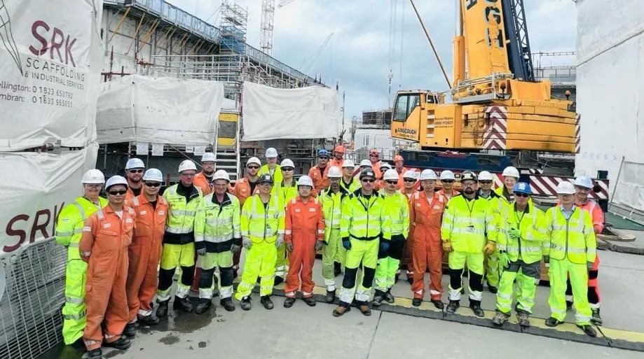 中核華興項目建設(shè)團隊秉承中核集團重大工程精神,以協(xié)同合作為導(dǎo)向,組織小規(guī)模團隊建設(shè),開展中方工人語言培訓(xùn),項目團隊從最初僅6名中方人員逐步擴展至30余人,全力保障現(xiàn)場工作高效開展。在第二個大罐吊裝準(zhǔn)備期間,項目部遭逢英國“達拉(Darragh)”風(fēng)暴,現(xiàn)場風(fēng)速峰值一度達到145公里/小時。項目團隊主動協(xié)調(diào)業(yè)主與吊裝分包商,抓住風(fēng)暴間隙,在2024年圣誕現(xiàn)場封控前,一舉完成大罐吊裝工作,獲HPC業(yè)主方NNB公司核島總經(jīng)理與儲罐項目經(jīng)理高度贊揚。