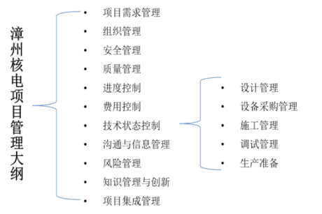 “華龍一號”示范工程結合中國30年的核電工程建設經驗,以系統性思維策劃了《“華龍一號”示范工程項目管理大綱》,在工程建設四大控制、四大領域以及不同階段明確了頂層管理要求。在漳州核電“華龍一號”建設過程中,進一步系統性對項目管理大綱進行優化完善。